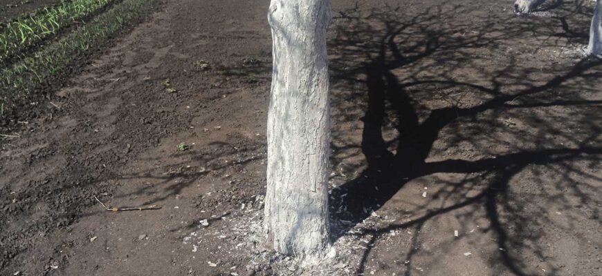 Состав для побелки готовиться на основе гашеной извести с добавлением глины и столярного клея для лучшего прилипания. Обязательно перед побелкой нужно очистить ствол от старой коры и лишайников — так защита продержится до весенних дождей.
