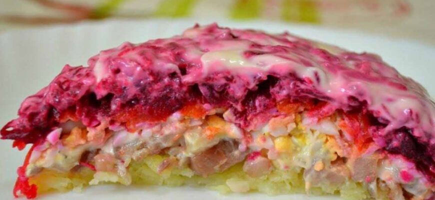 Готовый салат выглядит нарядно и аппетитно благодаря контрасту нежных слоев и яркой зеленой посыпки. Подавайте его как центральную закуску на праздничном застолье или как сытное дополнение к семейному ужину. Это блюдо уверенно стоит на любом столе, предлагая знакомые ноты в новом, освежающем звучании