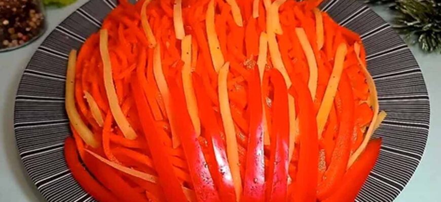 Перед самой подачей обильно посыпьте салат мелко рубленым зеленым луком. В итоге вы получите эффектное блюдо с четкими, переливающимися слоями огненных оттенков. Он идеально подходит как для шумного праздничного застолья, так и для романтического ужина. Подавайте его сразу же, пока хрустящий перец сохраняет свою форму и текстуру, наслаждаясь этим взрывом свежести и гармонии.