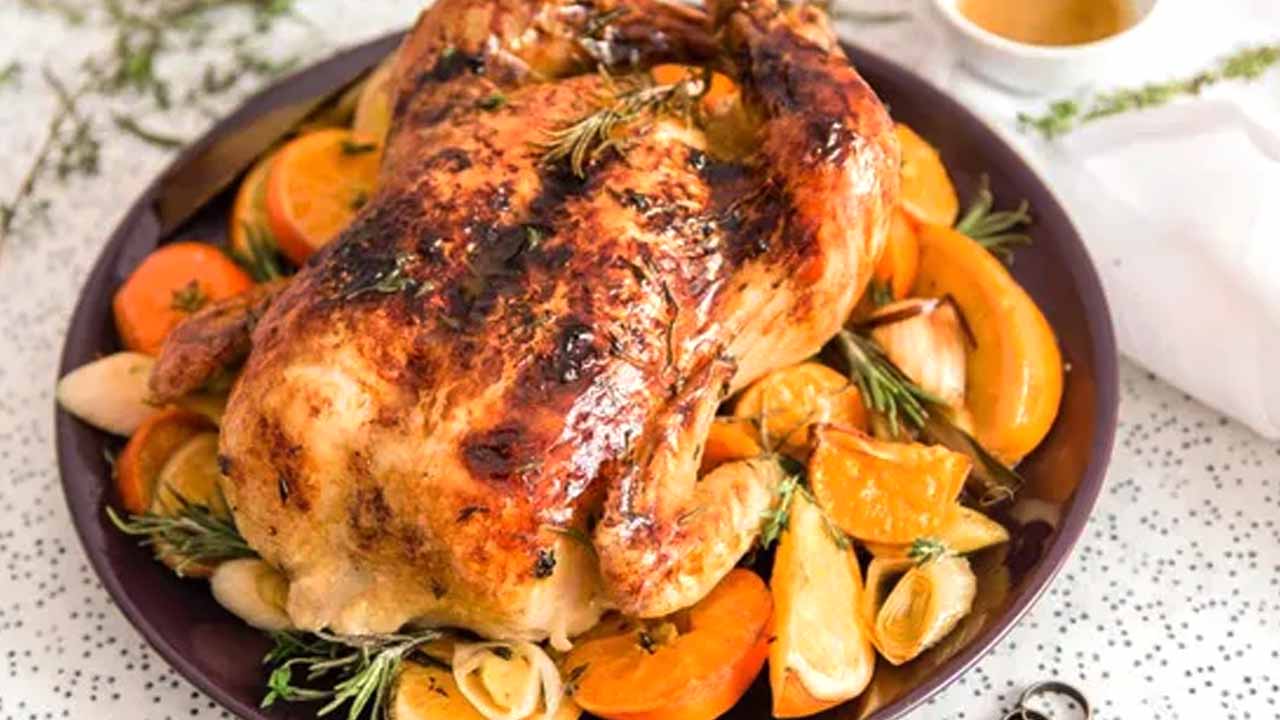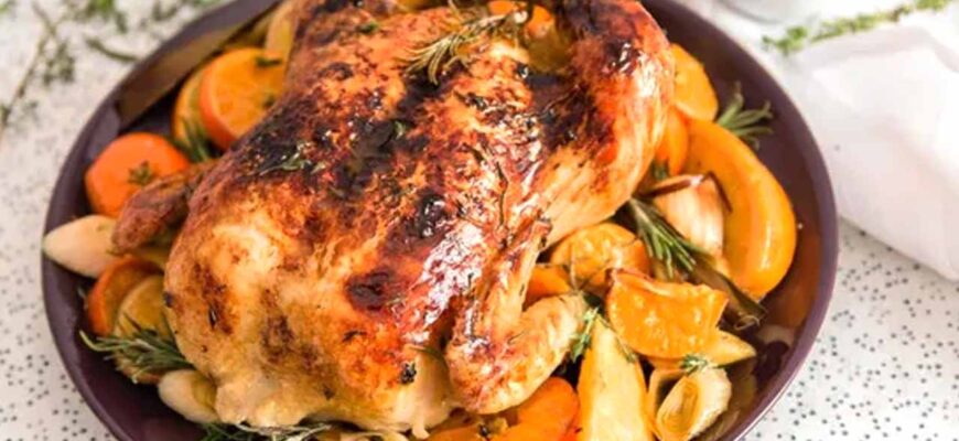 В итоге вы получите великолепную золотисто-коричневую курицу с блестящей цитрусовой корочкой, окруженную карамелизованными овощами и апельсинами. Мясо под кожицей будет сочным, пропитанным ароматами розмарина, чеснока и цедры. Подавайте блюдо прямо в форме, дав ему предварительно 10–15 минут отдохнуть под легким прикрытием фольги. Оно самодостаточно для семейного ужина, но станет и достойным центром праздничного стола, особенно в новогоднюю ночь