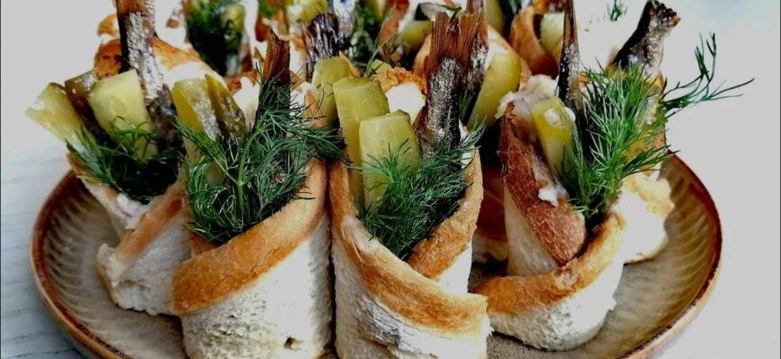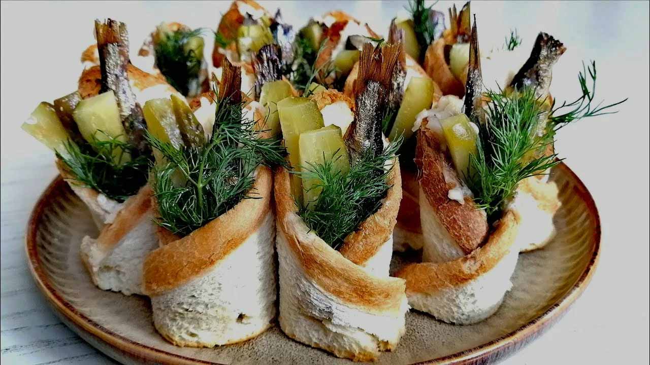 Представьте хрустящую, подрумяненную корзиночку из воздушного хлеба. Внутри ее ждет нежная, пикантная начинка из творожного сыра с острым хреном. Вертикально, подобно пловцу на старте, в ней замерла золотистая шпрота в обрамлении кисловатого маринованного огурца, а свежий укроп завершает этот сочный и аппетитный образ.