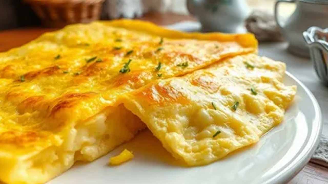 Вы заметите, как омлет увеличится в объеме в два-три раза и полностью схватится. Вторую сторону обжаривать не нужно. Аккуратно приподнимите один край широкой лопаткой и сложите лепешку пополам. Стороны легко слипнутся, образуя ту самую упругую, но мягкую внутри пышку.