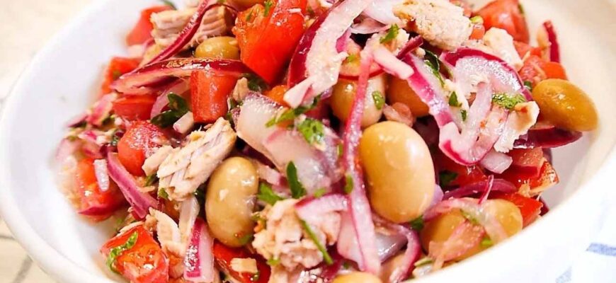 Готовый салат выглядит очень аппетитно: светлые зерна фасоли, кусочки тунца, рубиновые полукольца лука и яркая зелень. Подавайте его сразу, можно с ломтиком хрустящего хлеба или на подушке из листового салата. Это идеальный вариант для сытного семейного ужина в будний день, для пикника или когда гости уже на пороге.
