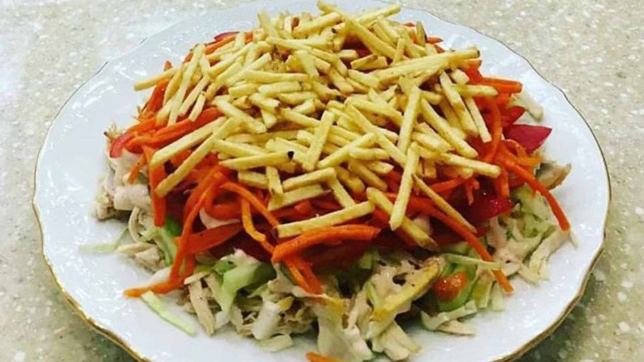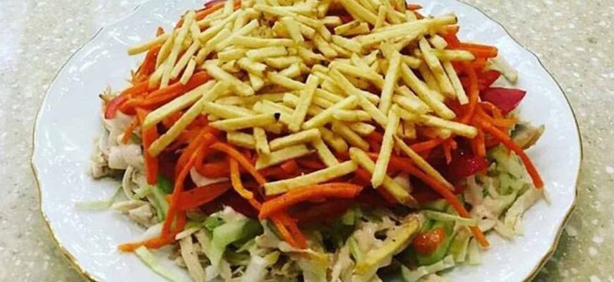 Этот салат сочетает хрустящую свежесть овощей, нежное маринованное мясо и бархатистый, пикантный соус. Его вкус насыщенный и запоминающийся, с яркими нотами чеснока, цитрусового маринада и пряной хмели-сунели. Текстура играет контрастами: сочная капуста, упругие помидоры, тающая во рту курица.