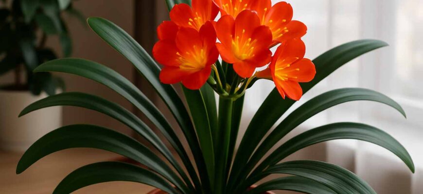 | Кливия киноварная (Clivia miniata) | До 50 см | Крупные, воронковидные (10–20 шт.) | От оранжевого до персикового, розового и бледно-желтого |