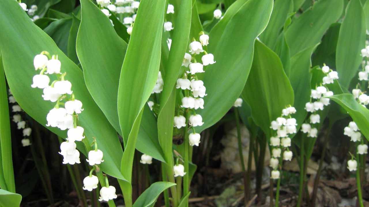 Ландыш майский. Его узнает каждый: белые колокольчики и тот самый запах, который ни с чем не спутаешь. В лесу ландыши всегда белые, а садовые сорта бывают с розовым отливом, с полосками и даже махровые. Есть виды с листьями в желтую полоску.