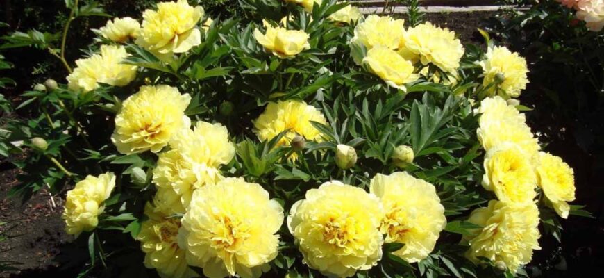 Бартзелла. Самая известная звезда среди ИТО-гибридов. Это куст высотой до метра с мощными стеблями. Цветет с середины июня около месяца. Полумахровые цветки (15–25 см) имеют насыщенный лимонно-желтый цвет с легкими красными штрихами в центре. Сорт выдерживает морозы до -35°C и почти не болеет.