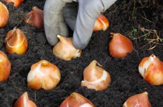 Перед посадкой снова замочите луковицы в растворе фунгицида на 30 минут. Затем сажайте их на рассчитанную глубину донцем вниз, на расстоянии 7–10 см друг от друга.