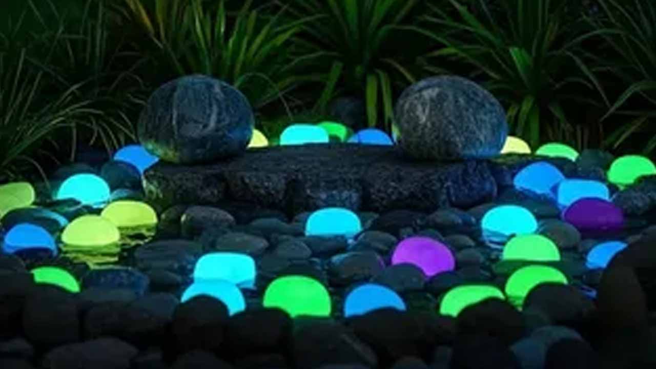 Это гирлянда из плоских светильников, похожих на обычные камни. Их бросают прямо на землю или слегка утапливают в грунт прямо на дорожке. Обычные фонари светят сверху вниз, а эти светят снизу вверх. В итоге получается мягкий свет, который льется из-под ног и четко показывает, куда идти.