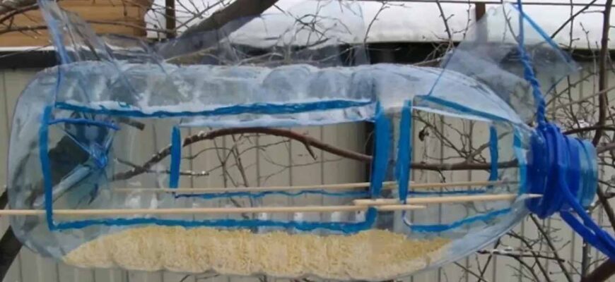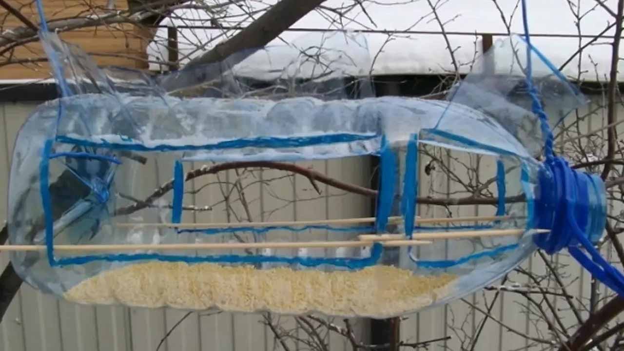 Самый надежный и вместительный вариант для сада или двора — кормушка из пятилитровой пластиковой бутылки. Она не боится ветра. Корма в нее помещается много, поэтому не придется бегать с досыпкой каждый час. Перед тем как начать, бутылку нужно хорошо вымыть и снять с нее все этикетки. Остатки клея собирают грязь, а химия на поверхности птицам ни к чему.